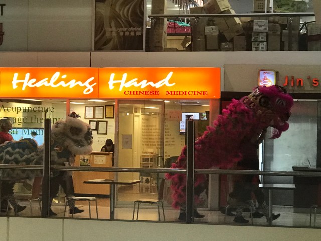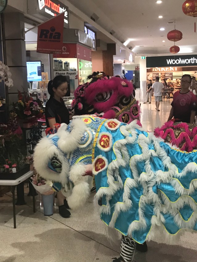 Fortunately this coincided with a couple of dragons visiting, with their percussion entourage. Watching them go around the shopping centre, eating lettuces and lucky red envelopes, and moving to the beat of the extremely loud percussion band, was wonderful.