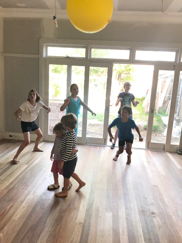 Miss G’s birthday party on the day, with cousins and neighbours in the unfinished extension.